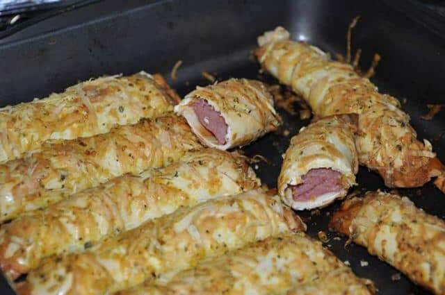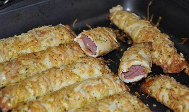 1º passo – Pegue metade da salsicha, enrole bem firme na massa de pastel, passe no ovo e depois na mistura de queijo com tempero2º passo – Coloque na forma untada e leve ao forno pré-aquecido, até que fiquem dourados e crocantes.
